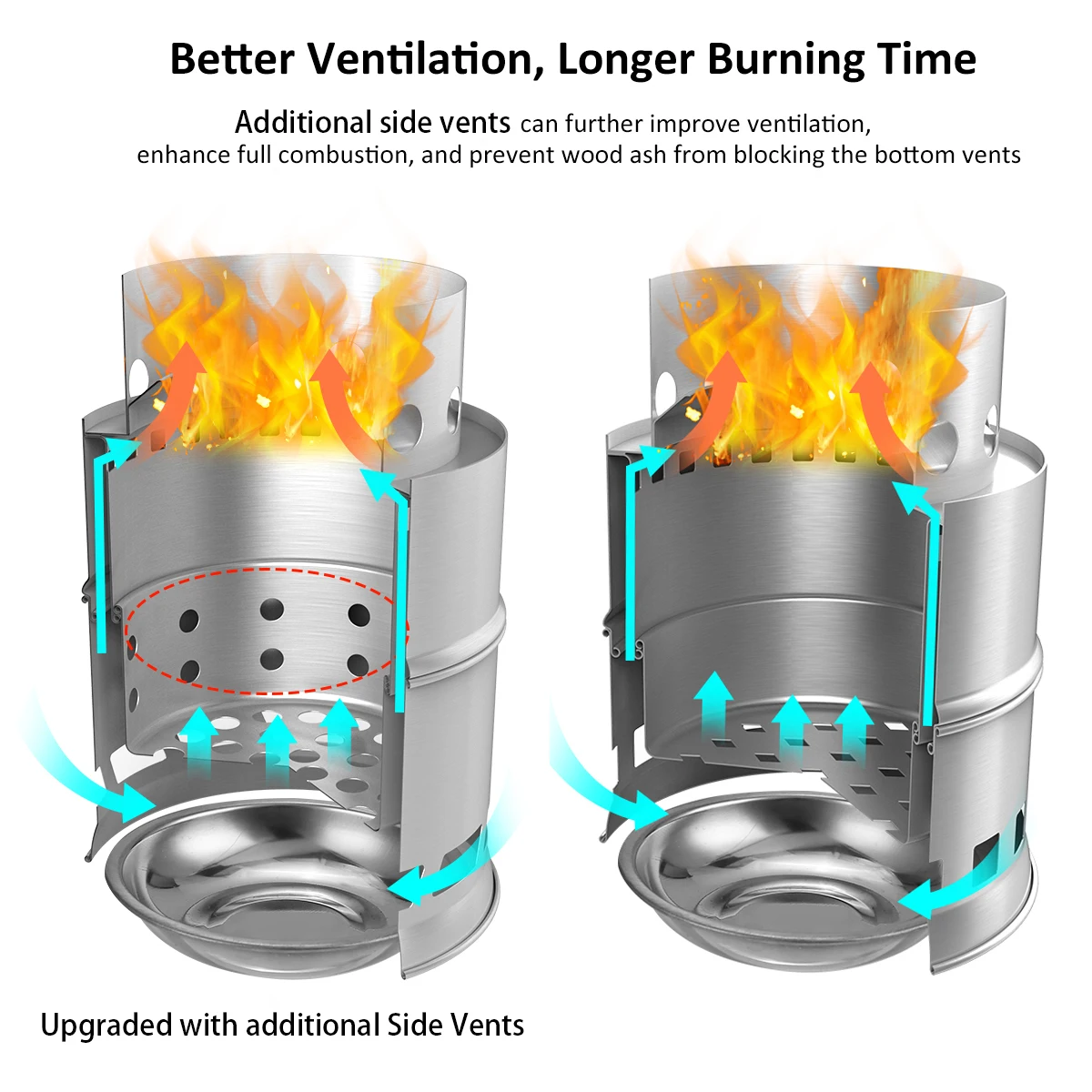 EFFICIENT BURNING, LESS SMOKE: The wood stove is designed with a simple yet scientific structure: Wide opening makes it easy to add wood; Double-wall structure creates a clean gasification and secondary combustion; Air vents near the bottom improve air circulation to help the fuel burn more completely with less smoke. It comes with a collapsible bellow which extends from 4.7 inch to 21.2 inch, keeping your face away from fire when adding oxygen.